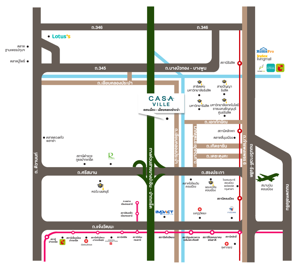 เจ้าของโครงการและผู้มีกรรมสิทธิ์ในที่ดิน : บริษัท คาซ่า วิลล์ (เพชรบุรี 2553) จำกัด ทะเบียนเลขที่ 0105553071860 สำนักงานใหญ่เลขที่ 1 อาคารคิวเฮ้าส์ ลุมพินี ชั้น 7 ถนนสาทรใต้ แขวงทุ่งมหาเมฆ เขตสาทร กรุงเทพมหานคร 10120 กรรมการผู้จัดการ : นายประวิทย์ โชติวัฒนาพันธุ์ ทุนจดทะเบียน 5,000,000,000 บาท (ชำระค่าหุ้นเต็มมูลค่าแล้ว) โครงการ คาซ่าวิลล์ ดอนเมือง-เลียบคลองประปา ที่ตั้งโครงการ ตำบล บ้านใหม่ อำเภอ เมืองปทุมธานี จังหวัด ปทุมธานี ใบอนุญาตจัดสรรที่ดิน เลขที่ 12/2568 ที่ดินโฉนดเลขที่ 3812, 146524, 146525 (รวม 3 โฉนด) เนื้อที่นำมาจัดสรร 40-3-12.4 ไร่ ทรัพย์สินส่วนสาธารณูปโภคและบริการสาธารณะ จำนวน 9 แปลง คิดเป็นพื้นที่โดยประมาณ 16-2-23.2 ไร่ เริ่มก่อสร้างประมาณ กุมภาพันธ์ 2567 คาดว่าจะแล้วเสร็จ ธันวาคม 2572 สโมสรและสระว่ายน้ำเป็นบริการสาธารณะ ทั้งนี้ บริษัทสามารถโอนกรรมสิทธิ์ที่ดินพร้อมสิ่งปลูกสร้างให้แก่ผู้ซื้อได้ภายใน 30 วัน หลังจากผู้ซื้อชำระราคาครบถ้วนแล้ว